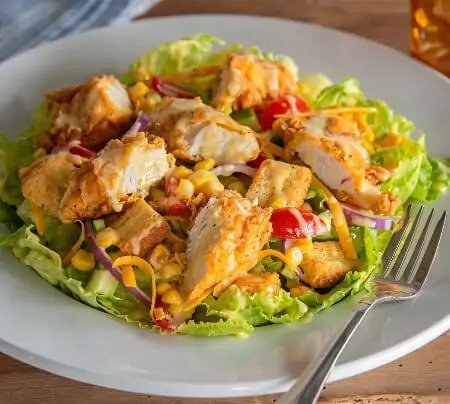 Freshly prepared crisp greens, sliced cucumbers, tomatoes and red onions topped with crunchy croutons and shredded cheddar cheese. Served with choice of dressing.